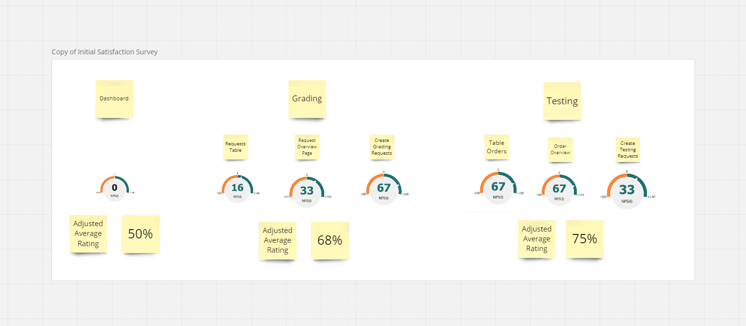 I sent out surveys to gauge approval of the current system and to start gathering requests from our user base. Next, I conducted user interviews with the primary types of users on the system: account managers, customers, and the internal grading team.