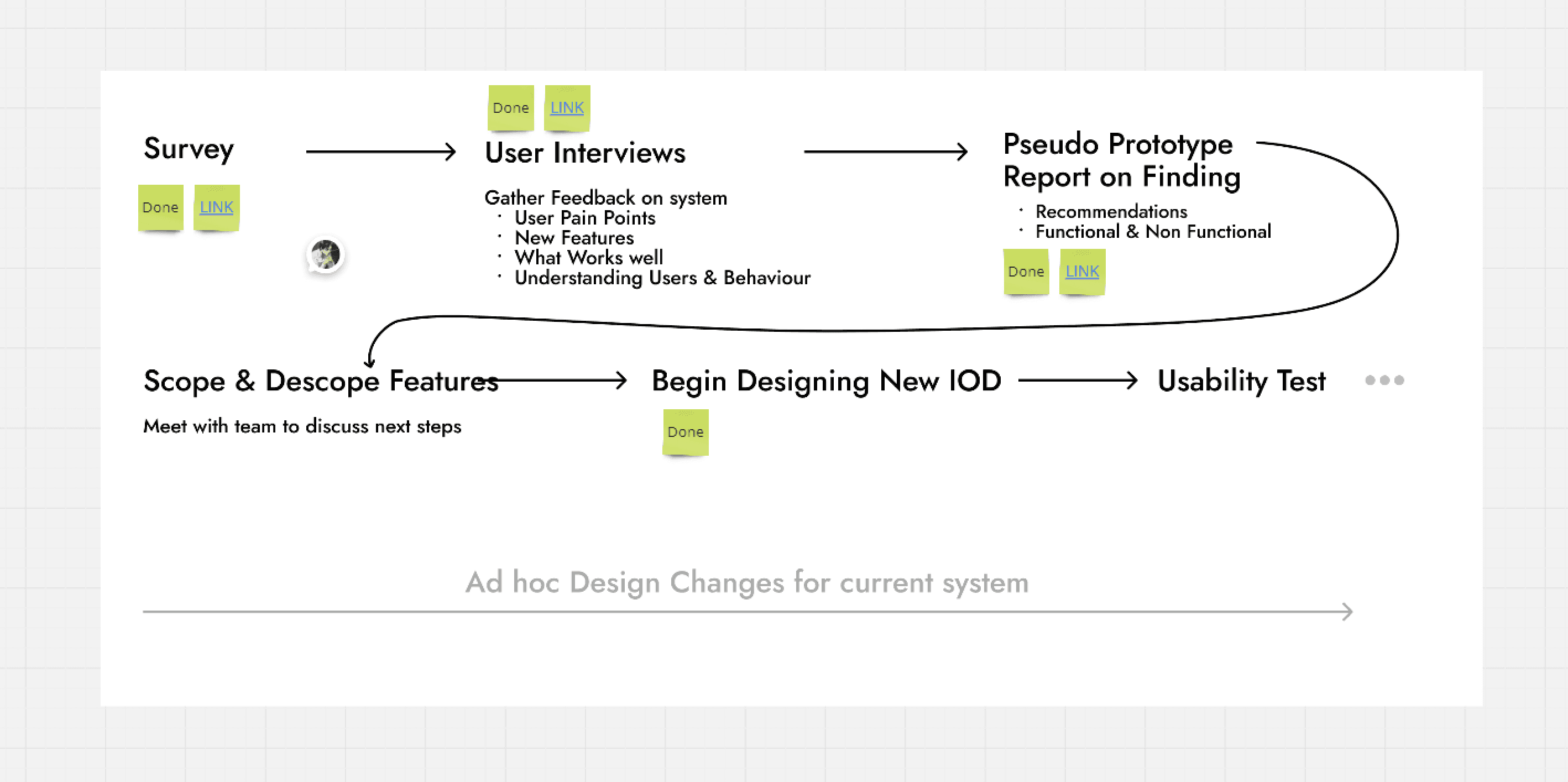 I used Miro to build out a roadmap. Since I needed to be available for ad hoc features, I wanted something to keep me on track when I had to step back into the old system for rapid enhancements.